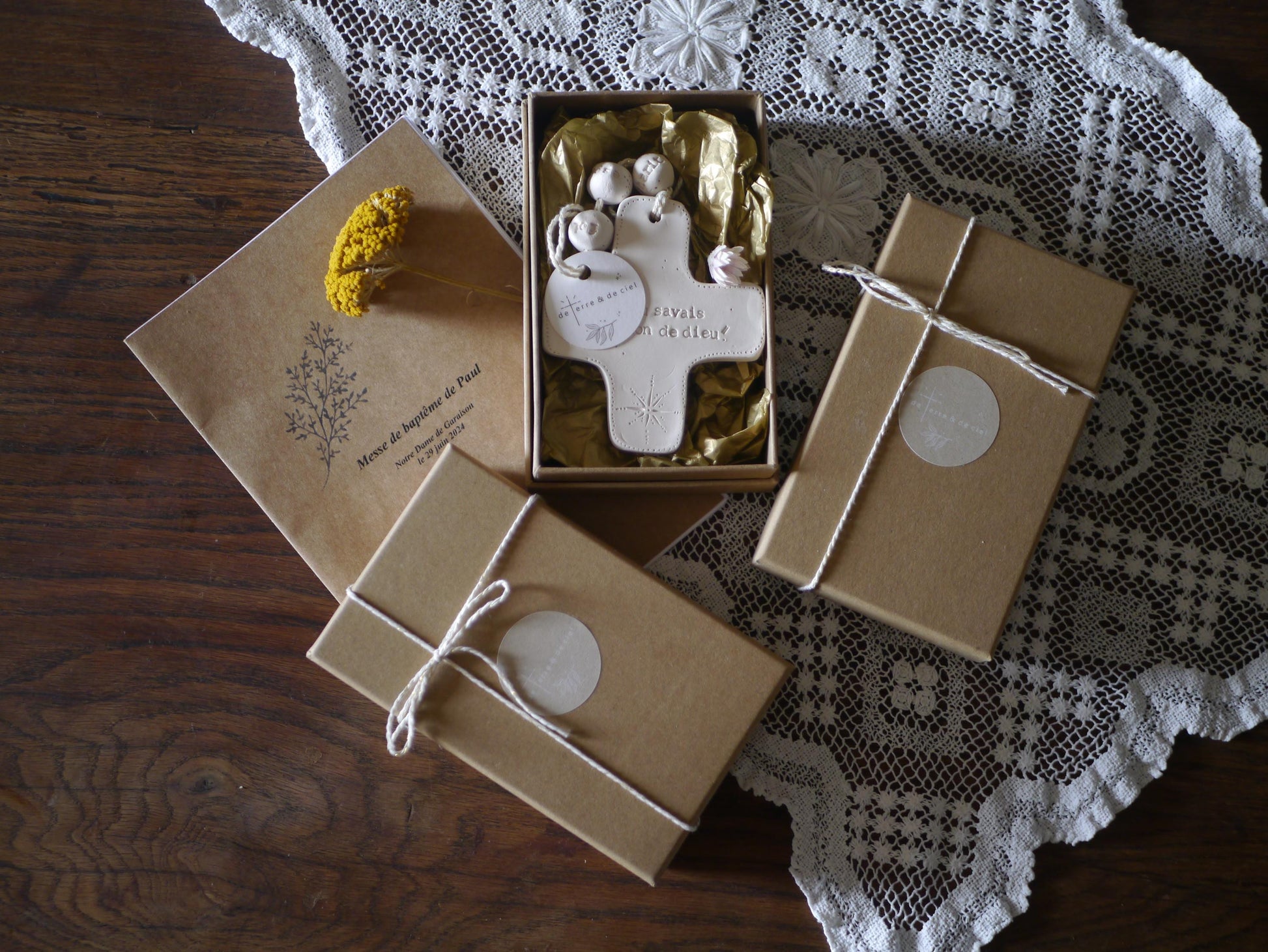 "De Terre & de Ciel" is a small artisanal brand born within a Christian family recently settled on a farm in the Pyrenean foothills. It is the result of a desire for a simple, rural life, rooted and nourished by faith. The small creations of "De Terre et de Ciel" invite us to move from the visible to the invisible, from everyday objects to Presence.