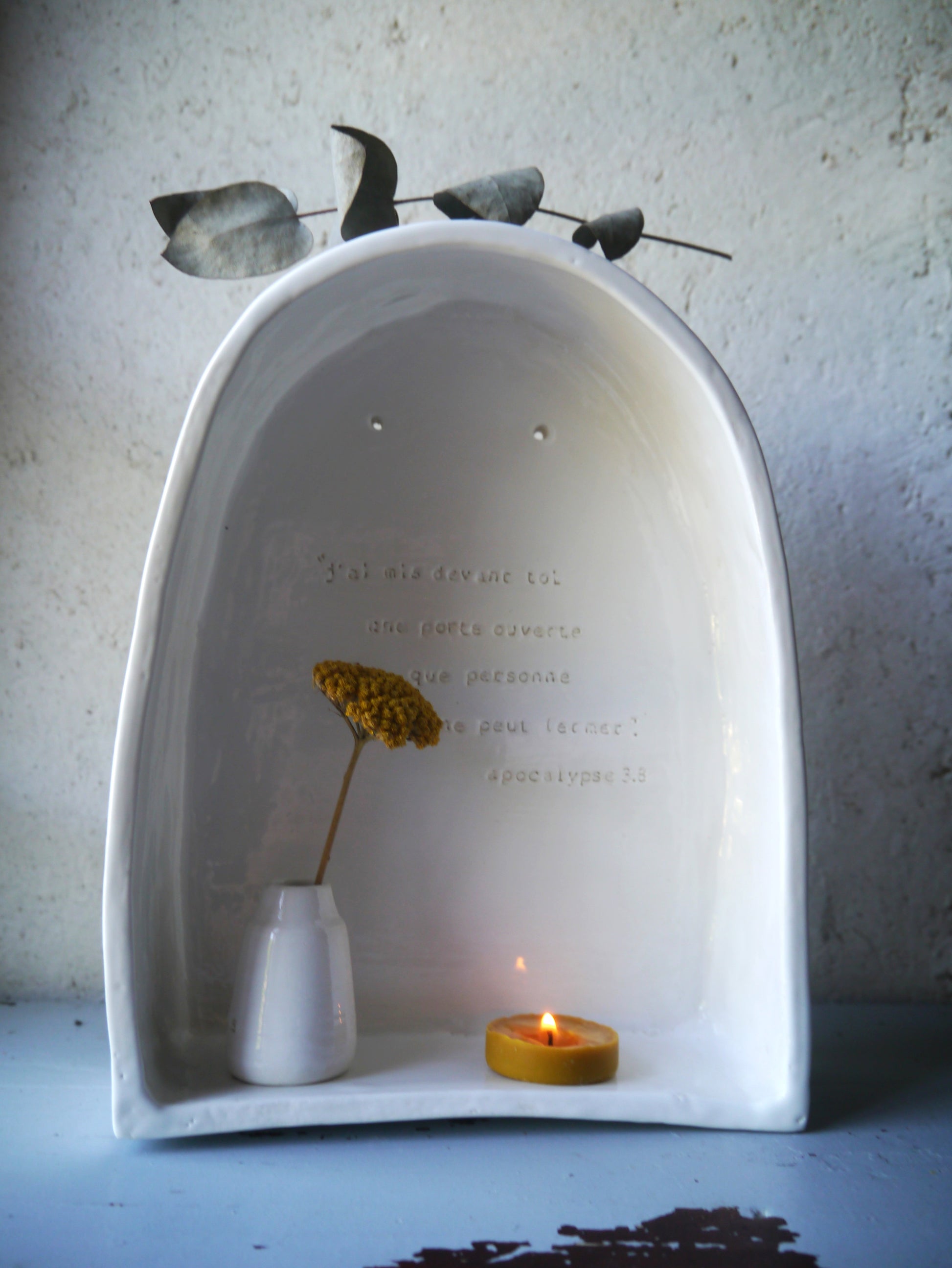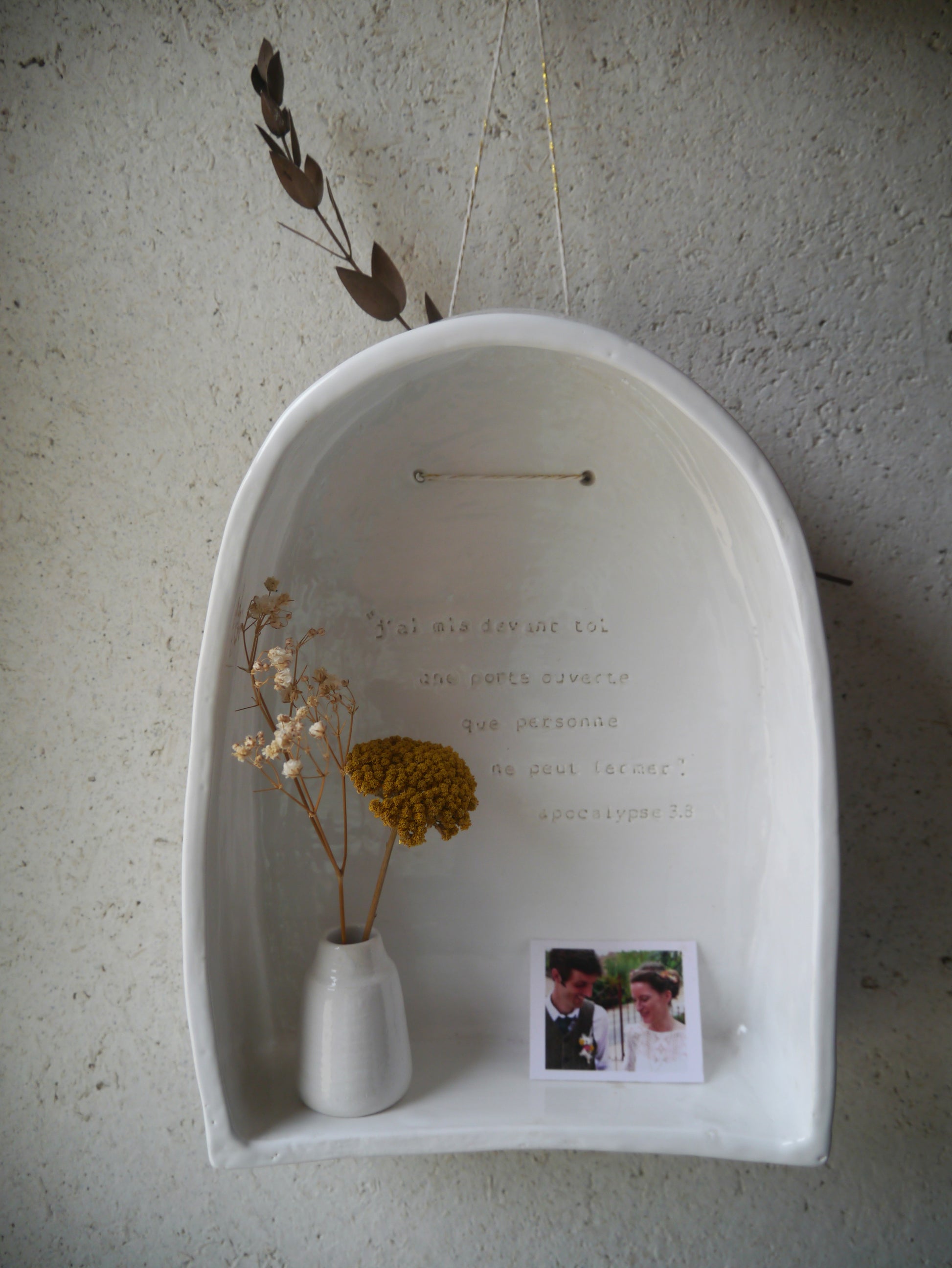 Ce petit autel discret, à placer dans l'entrée, où à dans un lieu de recueillement de votre foyer, a vocation à devenir le petit sanctuaire de votre maison. Cette petite niche suspendue peut accueillir une photo de famille, une bougie, un rameau béni, une croix, ou tout autre petit objet utile pour embellir et approfondir sa prière.