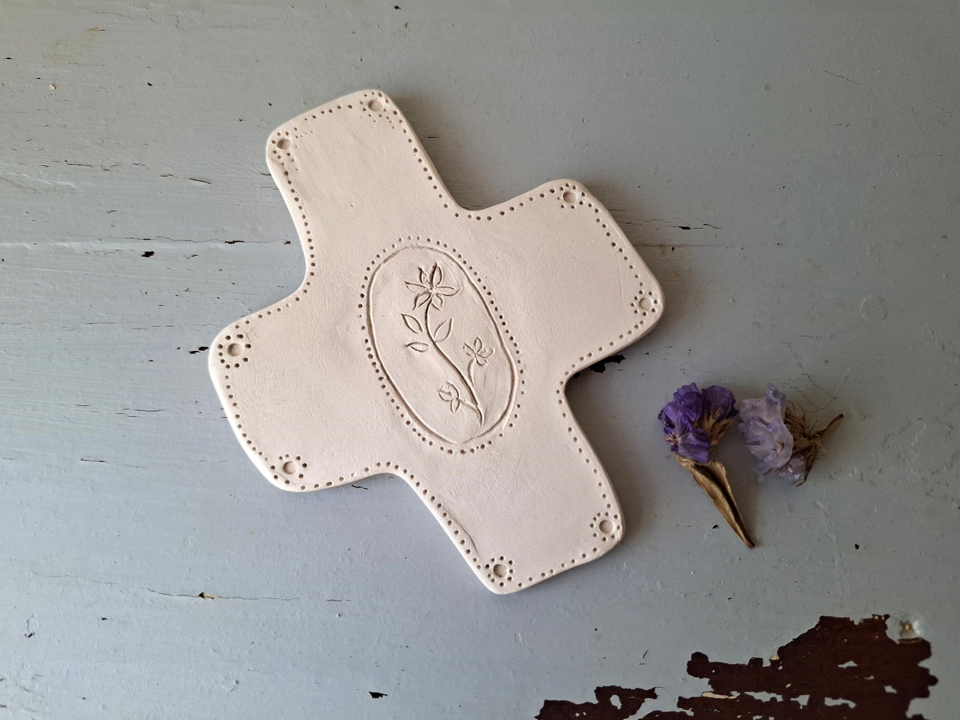 Ceramic cross, unique handmade piece; to hang in your prayer corner or to offer for a baptism (godchild), a first communion, a profession of faith, a confirmation, a wedding, or simply to a believing loved one.