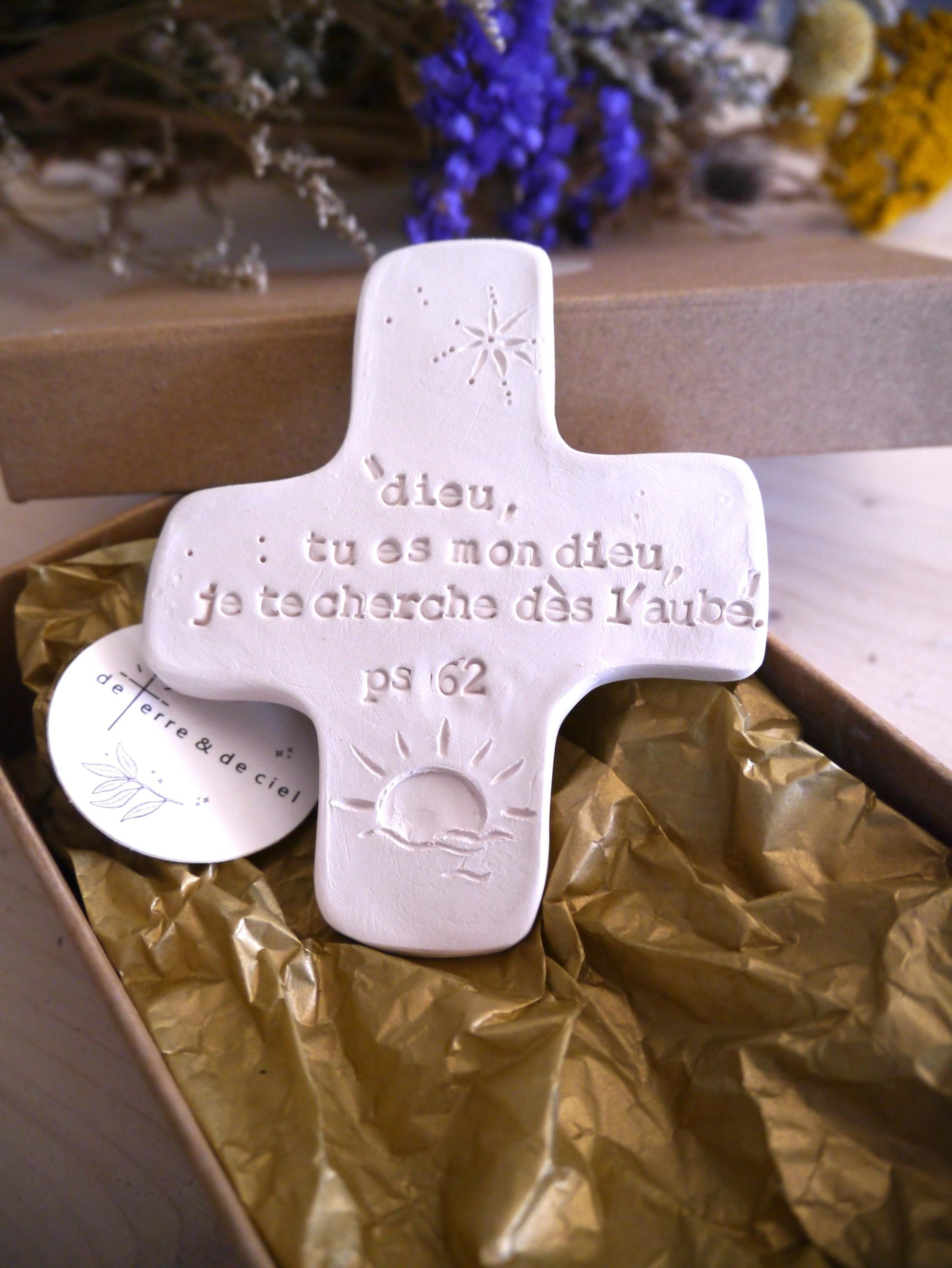 Each piece is unique, handmade and engraved with great care, in the inspiration of the moment. Made of raw stoneware (white earth) fired at 1280 degrees, they are delivered in their small, simple and precious box at the same time, they are the ideal gift to offer for a special occasion, or to accompany us in turning our hearts towards Heaven at any time and in any place.