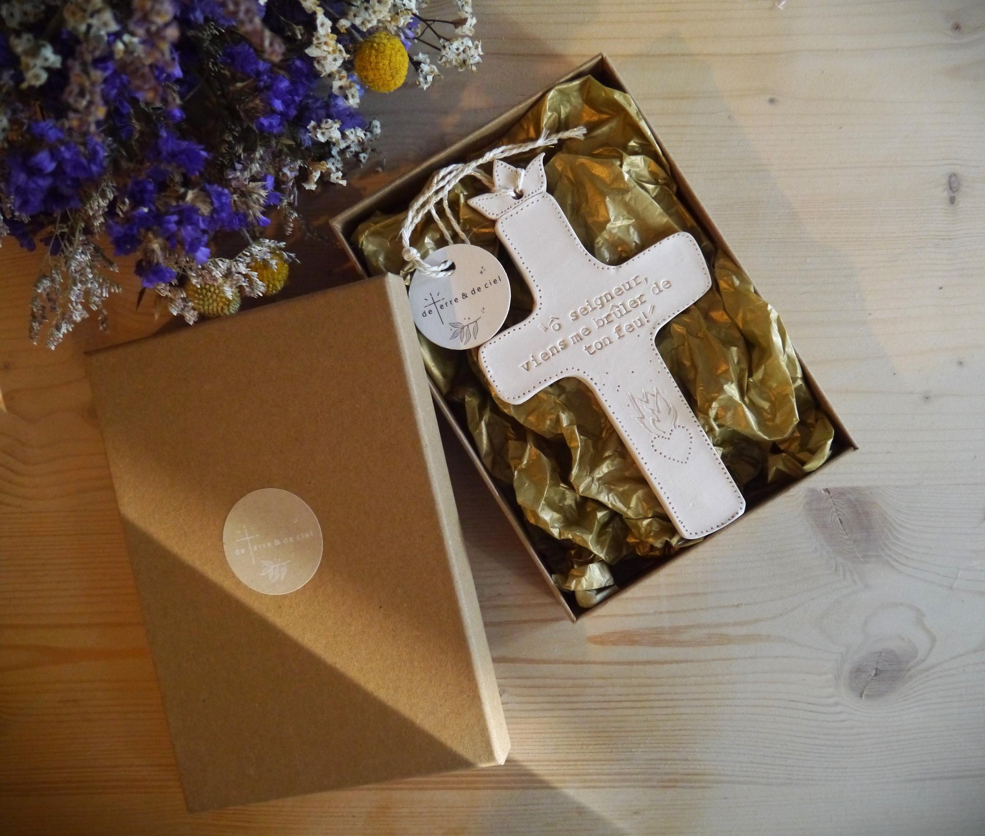 "De Terre & de Ciel" is a small artisanal brand born within a Christian family recently settled on a farm in the Pyrenean foothills. It is the result of a desire for a simple, rural life, rooted and nourished by faith. The small creations of "De Terre et de Ciel" invite us to move from the visible to the invisible, from everyday objects to Presence.