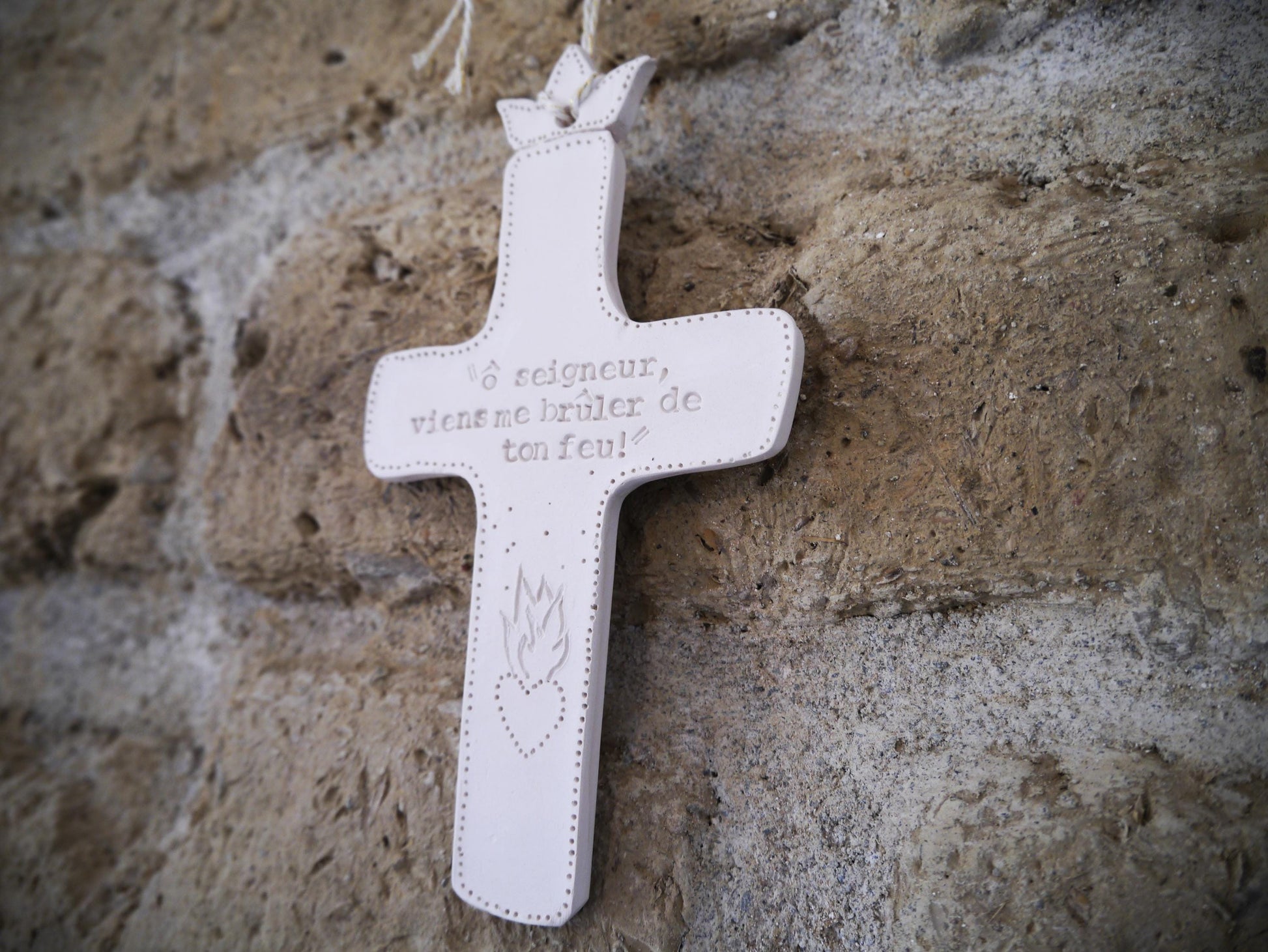 Each piece is unique, handmade and engraved with great care, in the inspiration of the moment. Made of raw stoneware (white earth) fired at 1280 degrees, they are delivered in their small, simple and precious box at the same time, they are the ideal gift to offer for a special occasion, or to accompany us in turning our hearts towards Heaven at any time and in any place.